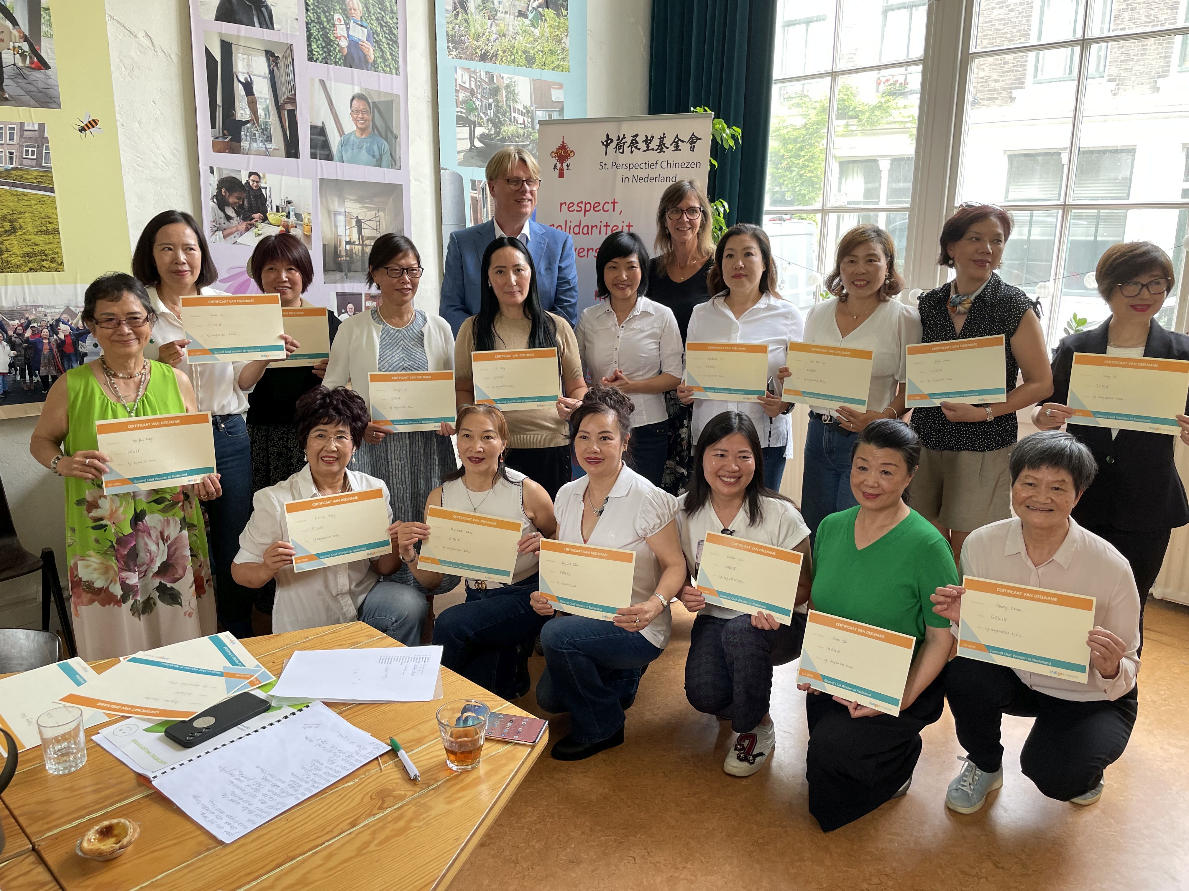 Wethouder Buijt was aanwezig bij een deel van de training. Na afloop heeft hij eigenhandig de certificaten uitgereikt en ging hij in gesprek met de deelnemers. Op positieve en enthousiaste wijze vertelden de dames in gesprek over wat de training hen heeft opgeleverd. Hij vroeg o.a. of zij nagedacht hadden over hoe waar oud te worden. Een van de deelnemers gaf vastberaden aan: “Ik wil niet oud worden in China. China is mijn moederland, maar Nederland is mijn vaderland!” Hij heeft de dames bij vertrek bedankt, gaf aan het fijn te vinden om aanwezig geweest te zijn en was positief over het resultaat van training. Maria Smedts: “Ik ben trots op collega’s, zoals Willy van Geest, trainer van deze groep. Maar natuurlijk ook op het bezoek van de wethouder. Fijn dat de gemeente de meerwaarde van deze interventie ziet en nu ook zelf ziet en hoort wat het deelnemers oplevert!"